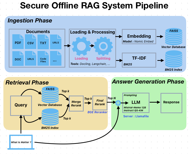 This award-winning Retrieval-Augmented Generation (RAG) system secured 1st place in the Secure RAG Challenge by UnderstandTech, demonstrating excellence in building secure, offline AI solutions with emphasis on data privacy and open-source technologies. I architected a sophisticated multi-stage pipeline that combines advanced document processing, hybrid retrieval mechanisms, and optimized language model integration. The system leverages Docling for superior PDF-to-Markdown conversion, implements a dual encoding strategy using Nomic Embed for semantic understanding and BM25 with TF-IDF for keyword matching, and utilizes FAISS vector database alongside a BGE Reranker to ensure highly relevant results. Through Llamafile integration, I achieved flexible CPU/GPU performance optimization, enabling efficient inference while maintaining resource control—all tested and optimized on hardware configurations with 32GB RAM and 8GB VRAM.